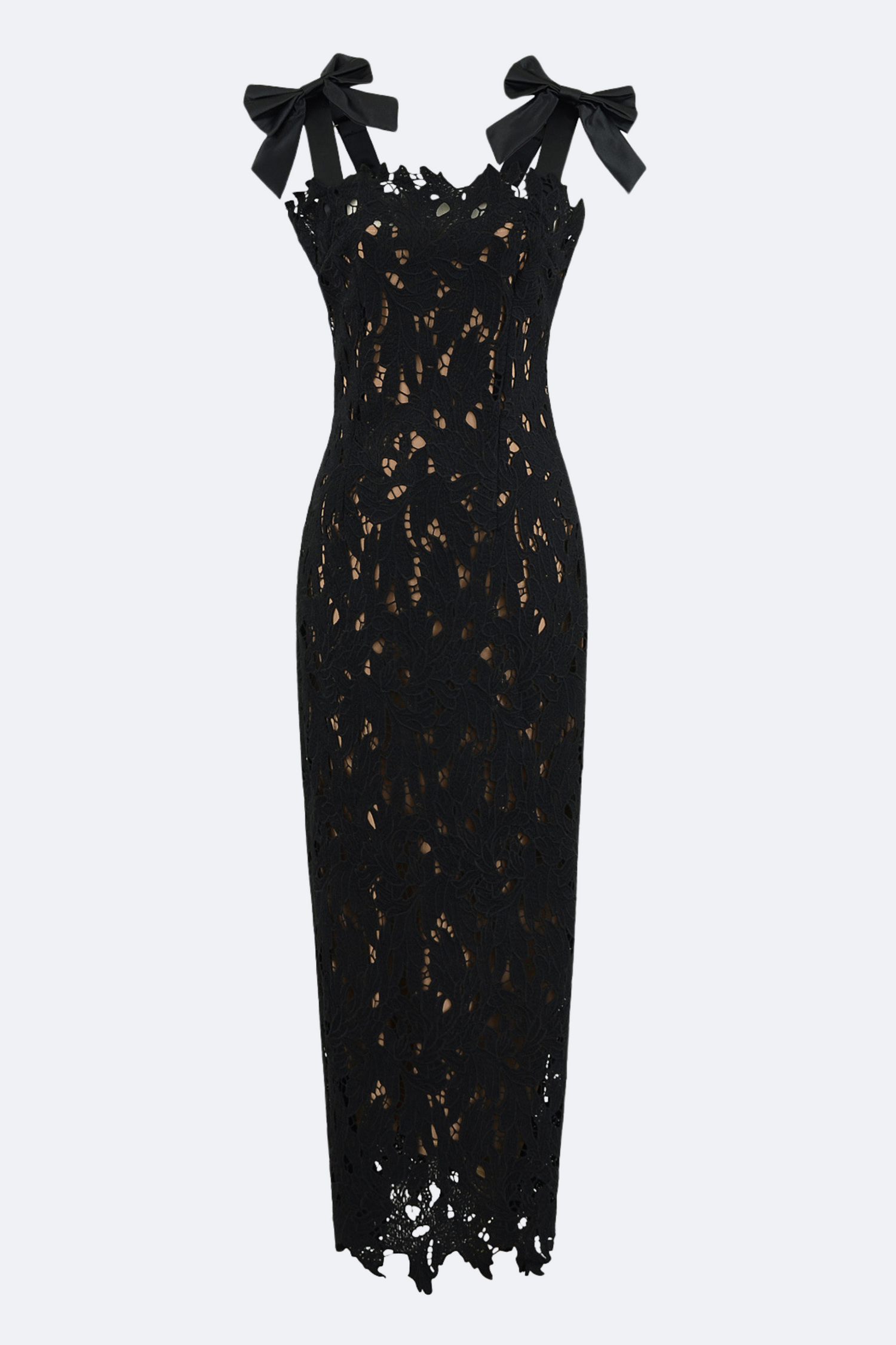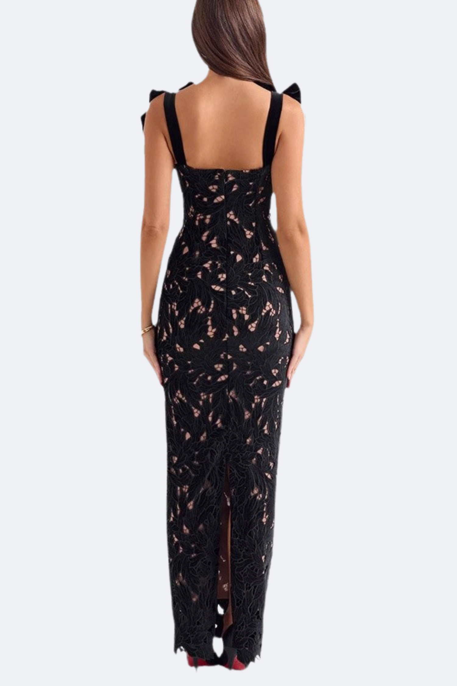 Introducing “Tiff” — the ultimate black velvet and lace maxi dress that adds instant drama to any occasion. This seductive black bodycon features a curve-enhancing silhouette, crafted from luxurious velvet lace, with plush velvet straps tied into delicate, playful bows for a touch of elegance. The dress is lined with a soft nude mesh, offering subtle coverage while allowing the intricate lace to stand out beautifully against the skin. Finished with a back slit for graceful movement, “Tiff” isn’t just another cocktail dress — it’s your invitation to make an unforgettable entrance… and an even more unforgettable exit.